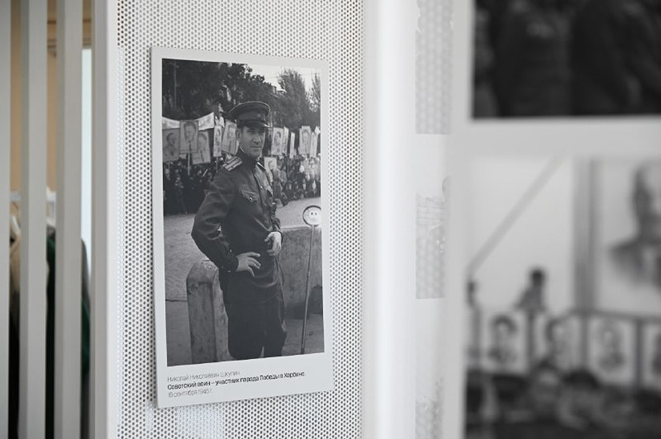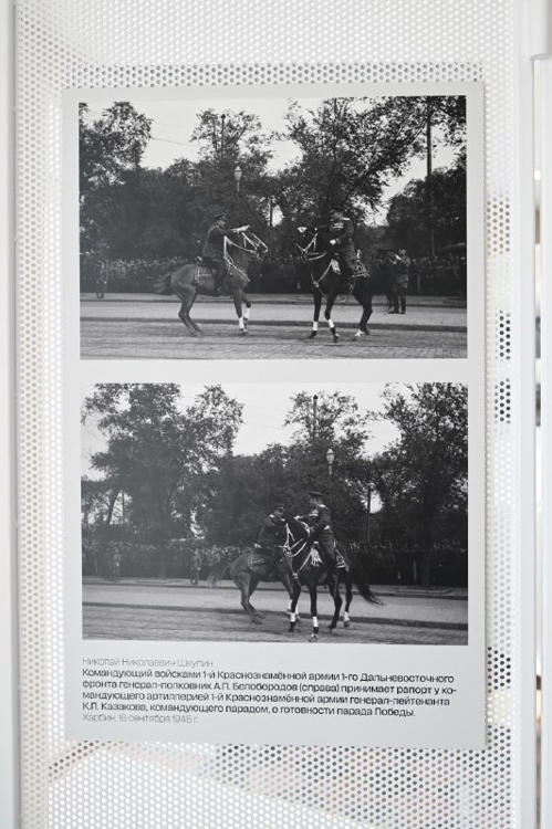 В экспозиции представлены уникальные материалы из собрания Гродековского музея — фотографии парада Победы фронтового фотокорреспондента редакции армейской газеты «На защиту Родины» 1-й Краснознамённой армии 1-го Дальневосточного фронта капитана Николая Николаевича Шкулина.
