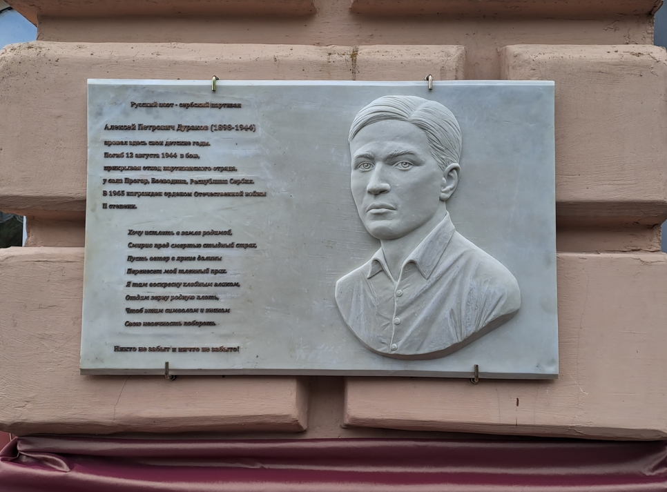 Алексей Петрович Дураков (15/27 мая 1898, с.Черкасское Пензенской губ. — 12 августа 1944, с. Прогар, Югославия) — преподаватель, поэт. Из дворянской семьи. После окончания Симбирского кадетского корпуса (1917) поступил в Морское училище в Петрограде. Ушёл в заграничное плавание на учебном крейсере «Орел», произведён в корабельные гардемарины (апрель 1920). В Дубровнике с августа 1920 года. Окончил философский факультет Белградского университета и его филиал в Скопье (1921-1930). До начала Второй мировой войны жил в городе Вранье на юге Сербии. Работал в детском доме, преподавал в местной гимназии. Публиковал стихи в различных сборниках. С первых дней войны включился в антифашистскую борьбу: распространял листовки и воззвания. Член Союза советских патриотов. Весной 1944 года вместе с женой переправлен в Посавскую партизанскую бригаду. 12 августа 1944 года Алексей Петрович Дураков погиб в бою на берегу реки Савы, прикрывая отход товарищей. Похоронен на месте гибели. Указом Президиума Верховного Совета СССР от 18 ноября 1965 года посмертно награжден орденом Отечественной войны II степени