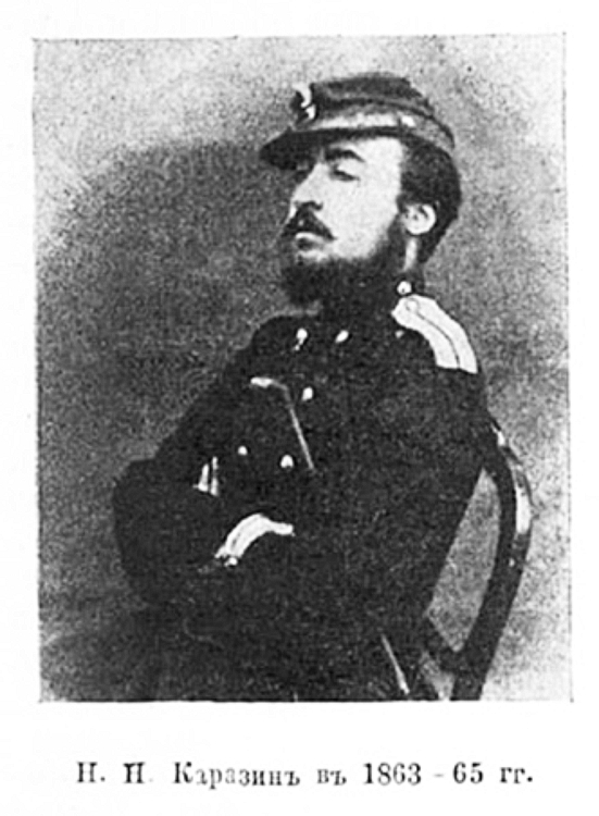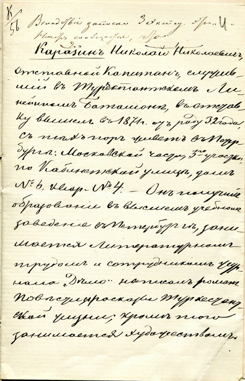 «Каразин Николай Николаевич отставной капитан, служивший в Туркестанском линейном баталионе, в отставку вышел в 1871 г. от роду 32 года, с тех пор живет в Петербурге: Московской части, 3-го участка Кабинетской улице, дом № 6, квар(тира). № 4. Он получил образование в высшем учебном заведении в Петербурге, занимается литературным трудом и сотрудником журнала «Дело» написал роман, повести и росказы Туркестанской жизни; кроме того занимается художеством в Клубе Художников и участвует в выставленных произведениях искуства. Женат имеет дочь. Брат его Владимир здесь и часто у него бывает. Летом привез в Ораниенбаум. Оба брата направления Либерального».