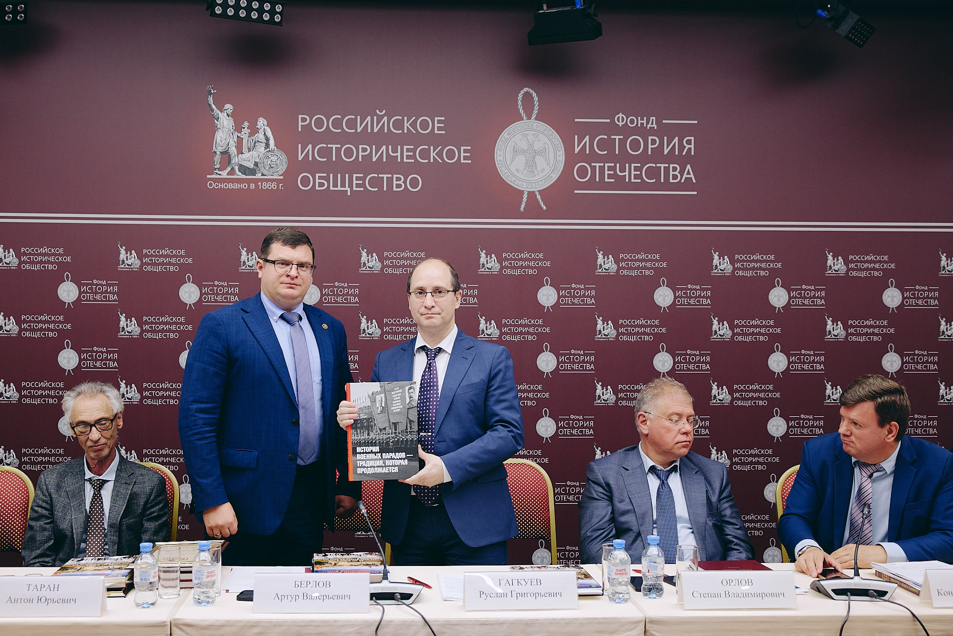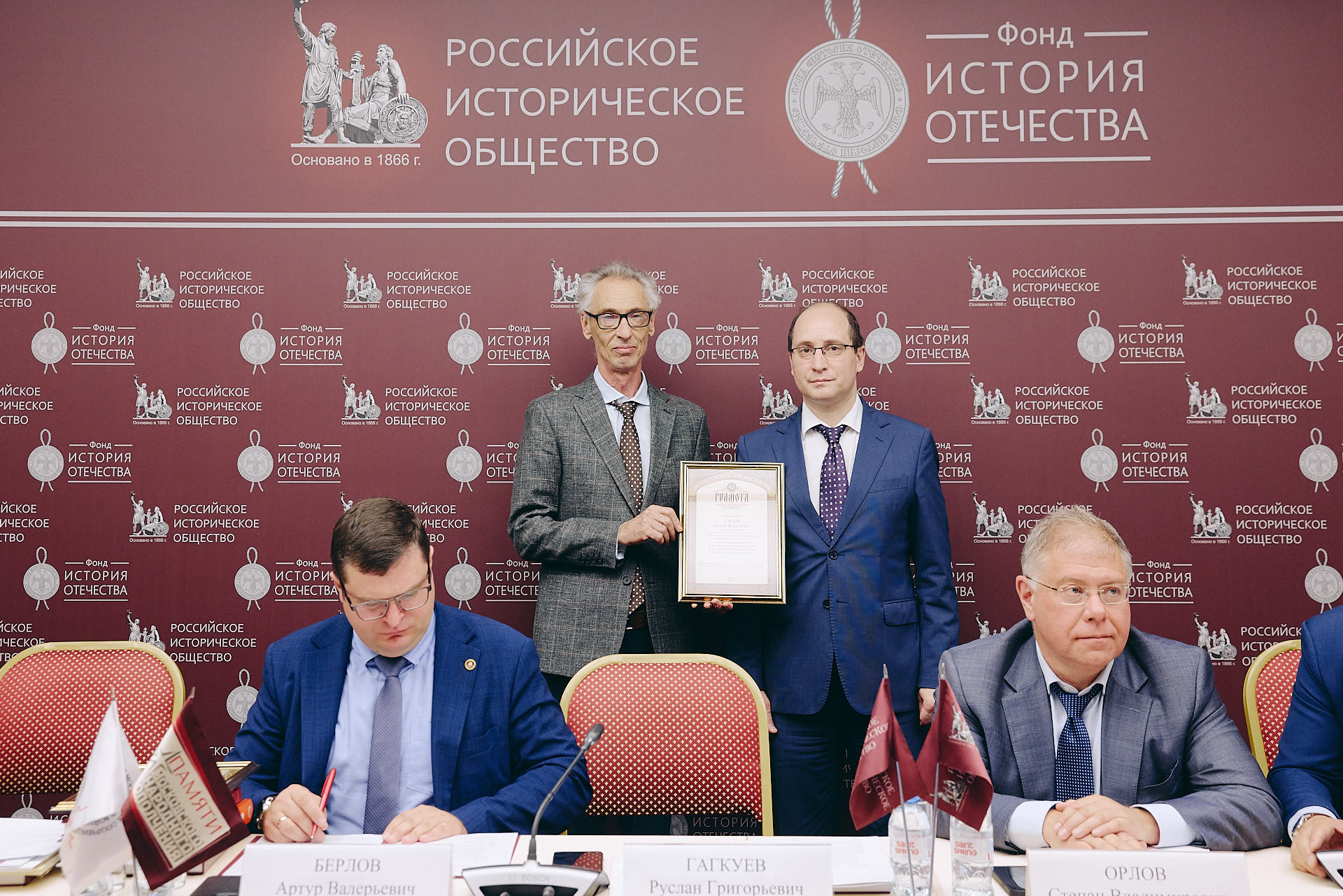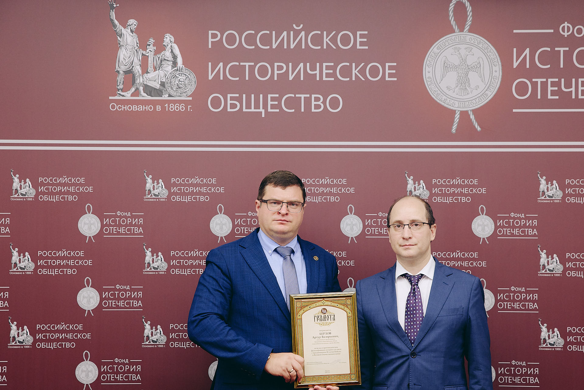 В ходе презентации Руслан Гагкуев вручил грамоты РИО за вклад в противодействие фальсификации истории и в связи с празднованием 80-летия Победы в Великой Отечественной войне Артуру Берлову и Антону Тарану.